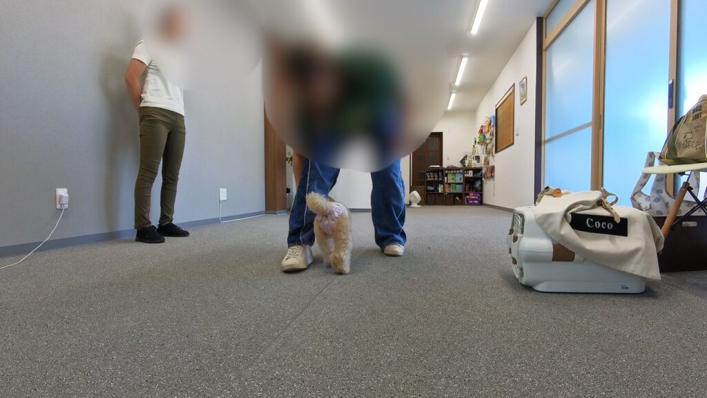 本来、Cocoちゃんのような小型犬は踏まれる危険性がある為、足の間をくぐったり側を歩くのは